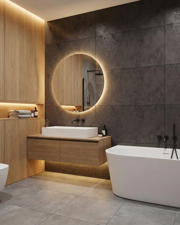 Sekret udanej aranżacji tkwi w dobrym towarzystwie. Płyty z betonu architektonicznego są mistrzami łączenia się z innymi surowcami. Ich stonowana estetyka stanowi idealny kontrapunkt dla naturalnego drewna, lśniącego szkła czy surowej stali, tworząc kompozycje pełne nowoczesnego charakteru. Dzięki tej elastyczności, beton nie jest przypisany do jednego miejsca. Z powodzeniem zdobi reprezentacyjne salony i łazienki, ale równie dobrze radzi sobie w przestrzeniach komercyjnych i biurowych.