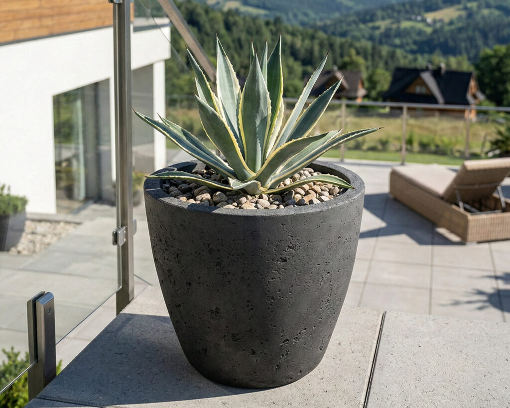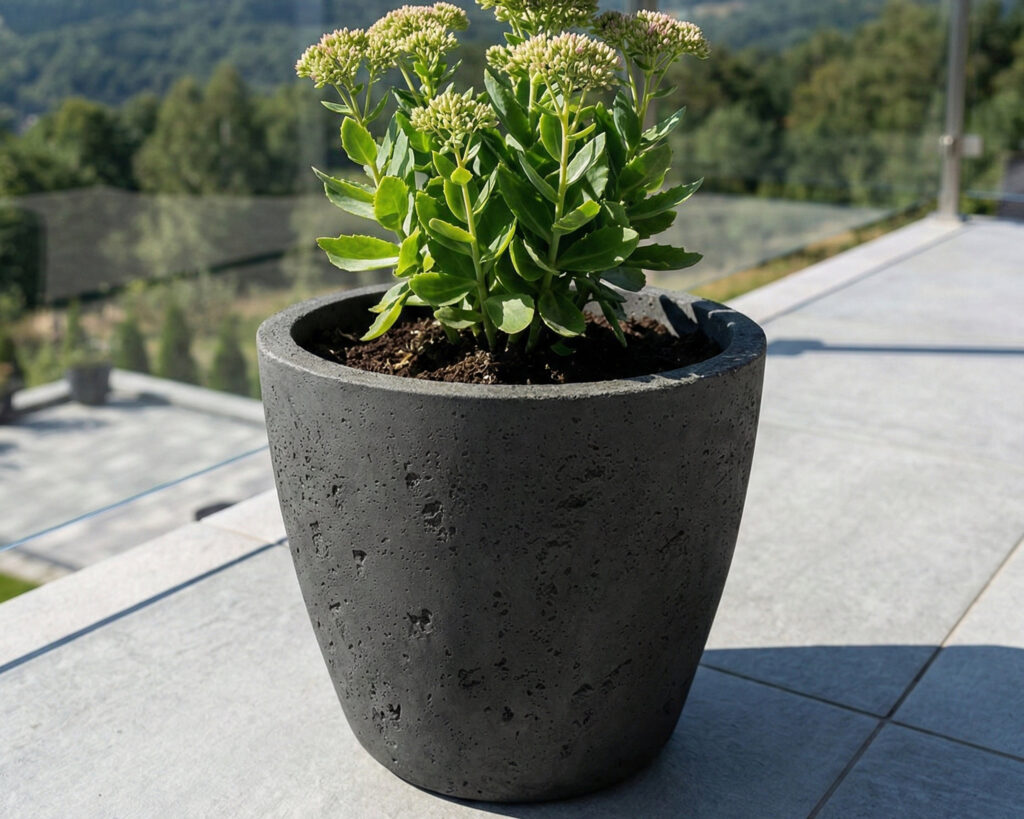 Czarna donica betonowa doskonale eksponuje naturalne piękno roślin, tworząc wyraziste i eleganckie tło dla soczystej zieleni liści oraz barwnych kwiatów. Głęboki, nasycony odcień czerni w połączeniu z surową strukturą betonu architektonicznego nadaje aranżacji nowoczesnego, luksusowego i ponadczasowego charakteru.