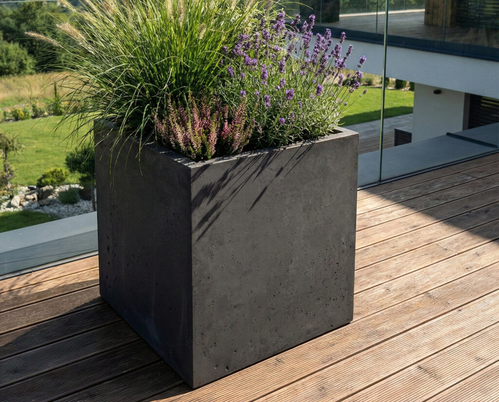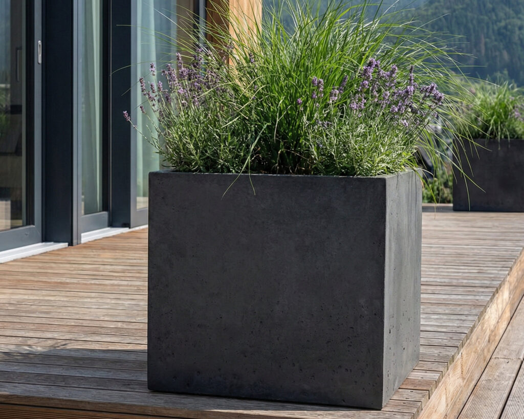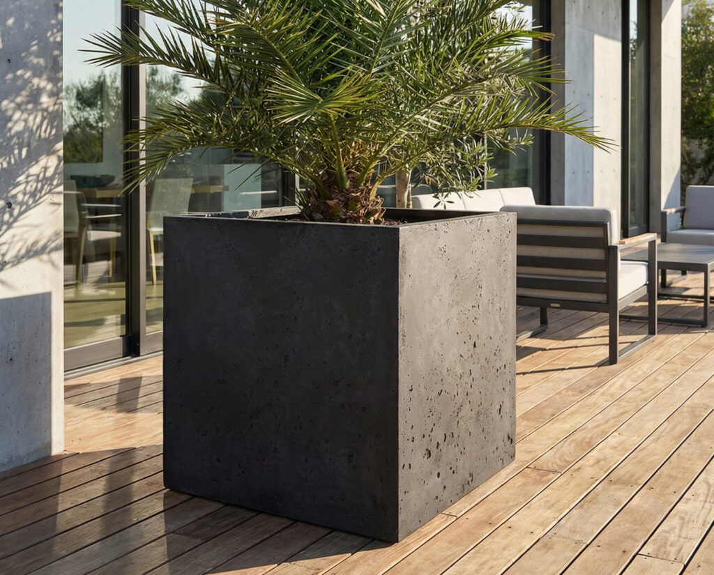 DONICA BETONOWA CALDEA 60X60X60 (CZERŃ SATYNOWA) – KWADRATOWA DONICA NA TARAS