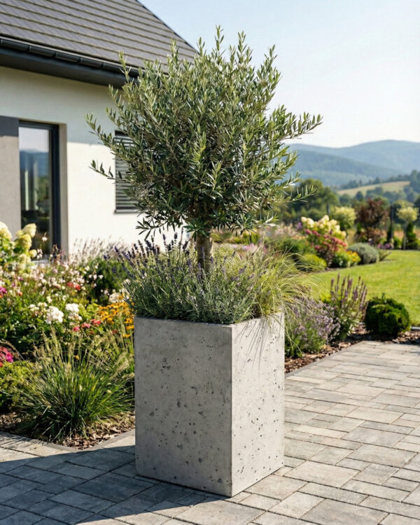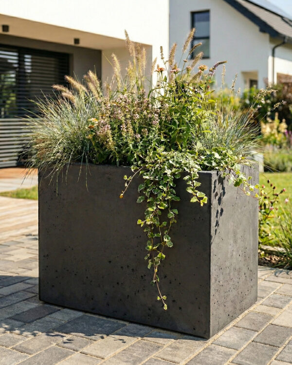 Donica z betonu architektonicznego 60×60×60 cm to nowoczesna, designerska propozycja do ogrodu, na taras, balkon oraz do przestrzeni komercyjnych i wnętrz loftowych. Geometryczna, sześcienna forma w połączeniu z surową strukturą betonu architektonicznego podkreśla minimalistyczny styl aranżacji i doskonale komponuje się z nowoczesną architekturą. Duży format 60x60x60 cm zapewnia odpowiednią przestrzeń dla rozbudowanego systemu korzeniowego roślin, co czyni donicę idealnym wyborem dla drzew ozdobnych, dużych krzewów, traw dekoracyjnych czy kompozycji sezonowych.