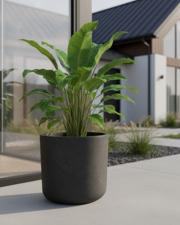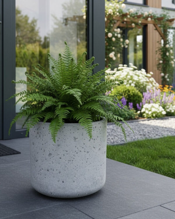 Wyobraź sobie ścieżkę w ogrodzie, której początek i koniec wyznaczają dwie monumentalne doniczki ogrodowe betonowe w neutralnym szarym odcieniu. Ten kolor doskonale podkreśla naturalne barwy kwiatów, traw i liści. Oprócz tego, dzięki dużej pojemności, ten model jest idealny jako donica betonowa wysoka do sadzenia miniaturowych drzewek owocowych lub traw ozdobnych, które potrzebują przestrzeni na korzenie.