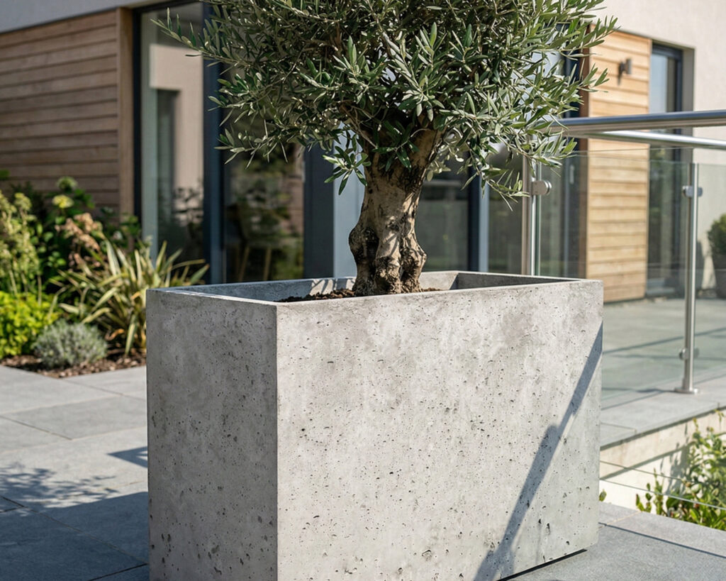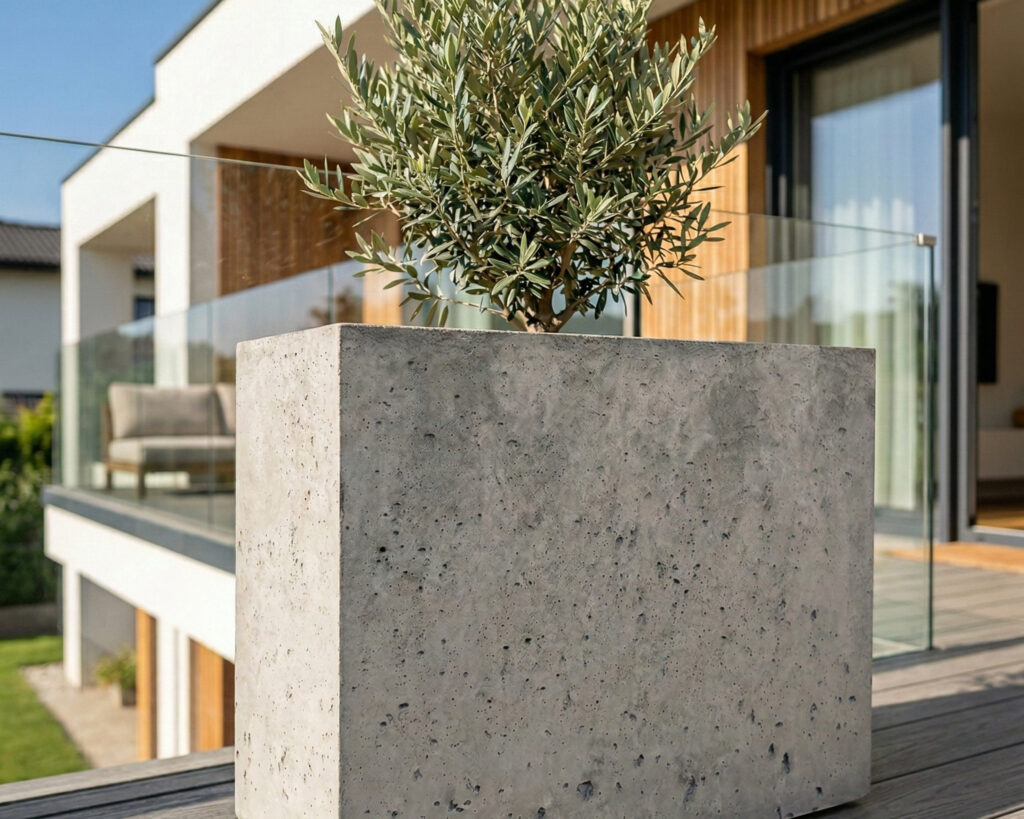 Donice betonowe w szarym odcieniu wyróżniają się naturalną, stonowaną kolorystyką, która subtelnie rozprasza światło i podkreśla surową strukturę betonu bez efektu połysku. Ich neutralna barwa nadaje aranżacjom harmonijny i ponadczasowy charakter, tworząc spójną bazę dla różnorodnych kompozycji roślinnych.