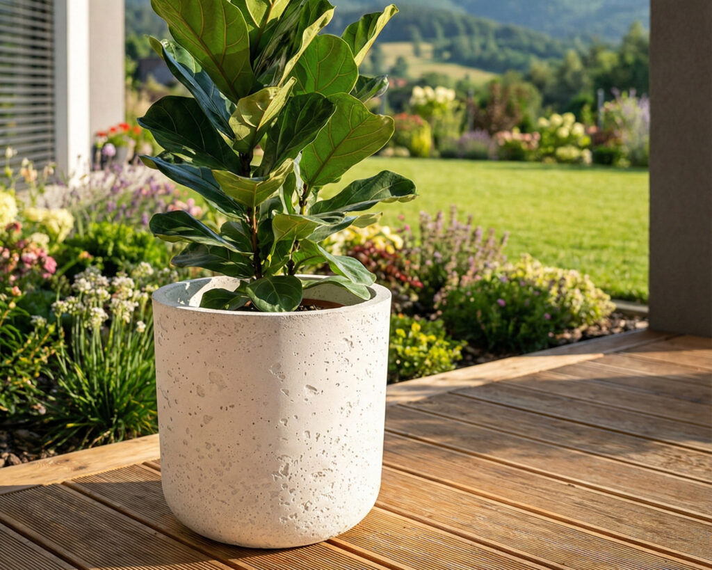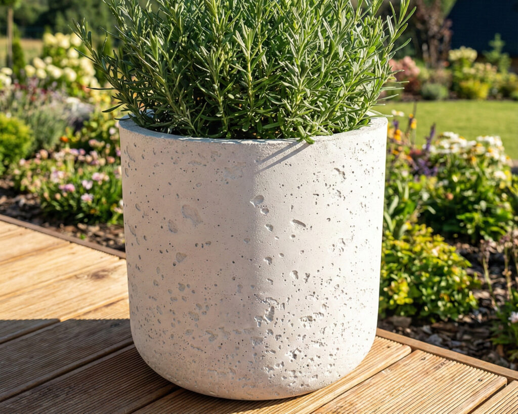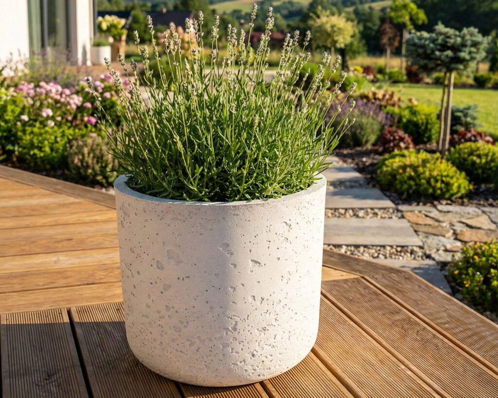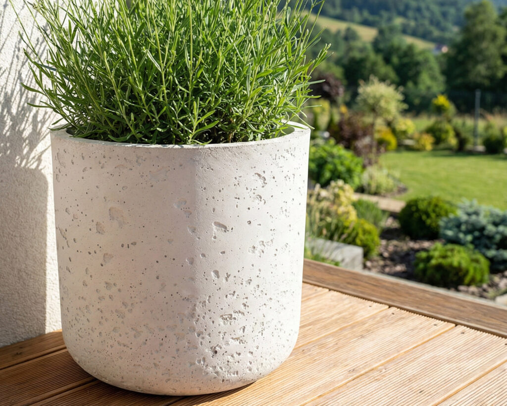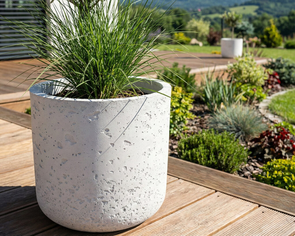 Donica z betonu w białym odcieniu to nowoczesne i ponadczasowe rozwiązanie, które doskonale sprawdza się w ogrodzie, na tarasie, balkonie oraz w eleganckich wnętrzach. Jasna, subtelna barwa betonu architektonicznego rozświetla przestrzeń i podkreśla świeżość aranżacji, stanowiąc idealne tło dla zieleni roślin oraz intensywnych kolorów kwiatów, tworząc spójną i harmonijną kompozycję.
