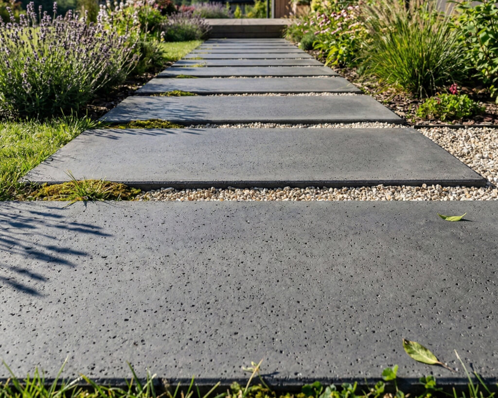 Płyty betonowe chodnikowe w odcieniu czerni satynowej wprowadzają do przestrzeni zewnętrznej elegancki, nowoczesny charakter inspirowany minimalistyczną estetyką architektury. Ich głęboka, satynowa kolorystyka podkreśla szlachetność betonu i stanowi wyrazisty, a jednocześnie ponadczasowy akcent w aranżacji nawierzchni. Czerń doskonale komponuje się z zielenią ogrodu, drewnem, stalą oraz szkłem, tworząc spójną i stylową przestrzeń wokół domu. Płyty świetnie sprawdzają się na tarasach, ścieżkach ogrodowych, podjazdach oraz w strefach wypoczynkowych, gdzie ważne są trwałość, estetyka oraz nowoczesny design.