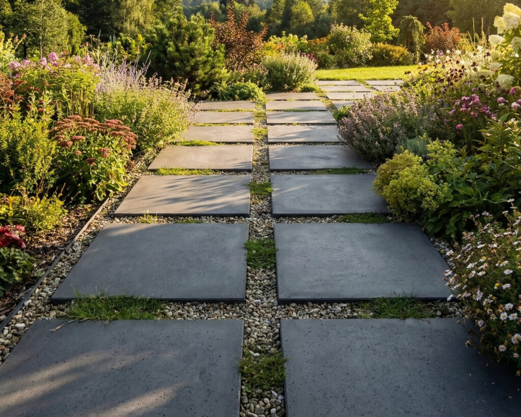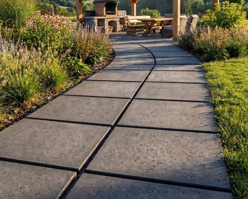 Płyty betonowe chodnikowe w odcieniu czerni satynowej wprowadzają do przestrzeni zewnętrznej elegancki, nowoczesny charakter inspirowany minimalistyczną estetyką architektury. Ich głęboka, satynowa kolorystyka podkreśla szlachetność betonu i stanowi wyrazisty, a jednocześnie ponadczasowy akcent w aranżacji nawierzchni. Czerń doskonale komponuje się z zielenią ogrodu, drewnem, stalą oraz szkłem, tworząc spójną i stylową przestrzeń wokół domu. Płyty świetnie sprawdzają się na tarasach, ścieżkach ogrodowych, podjazdach oraz w strefach wypoczynkowych, gdzie ważne są trwałość, estetyka oraz nowoczesny design.