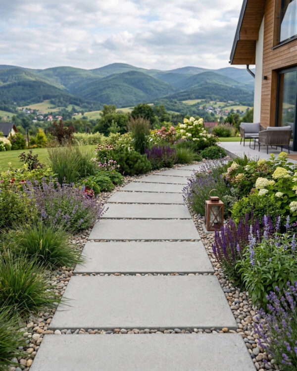 Płyta chodnikowa z betonu w odcieniu czerni satynowej to eleganckie i nowoczesne rozwiązanie przeznaczone do aranżacji przestrzeni zewnętrznych. Doskonale komponuje się z zielenią ogrodu, drewnem, stalą oraz szkłem, tworząc spójną i estetyczną przestrzeń wokół domu. Płyty świetnie sprawdzają się na tarasach, ścieżkach ogrodowych, podjazdach oraz w strefach wypoczynkowych, gdzie liczy się zarówno trwałość, jak i nowoczesny wygląd nawierzchni. Ich minimalistyczna forma i elegancka kolorystyka pozwalają stworzyć uporządkowaną, stylową aranżację przestrzeni, która podkreśla charakter współczesnej architektury.